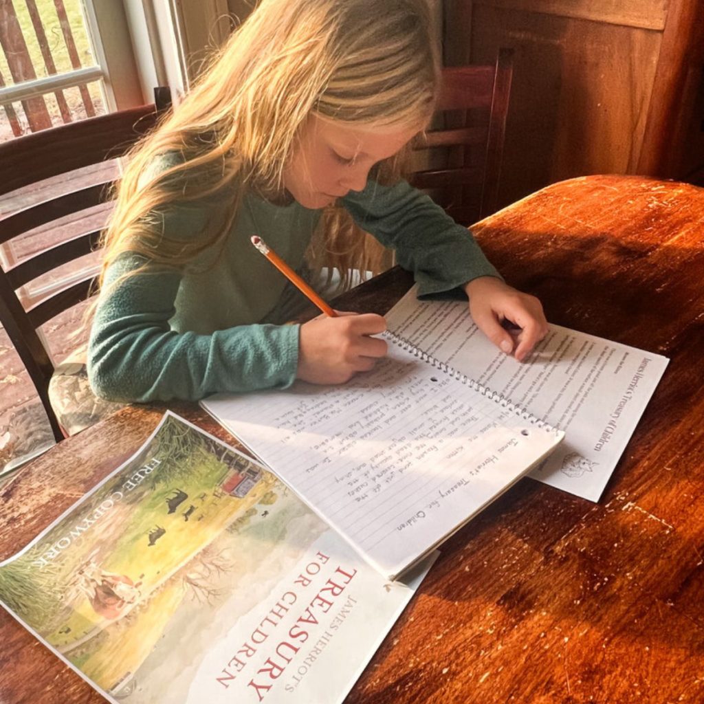 “The earliest practice in writing proper for children of seven or eight should be, not letter-writing or dictation, but transcription (copywork), slow and beautiful work.”